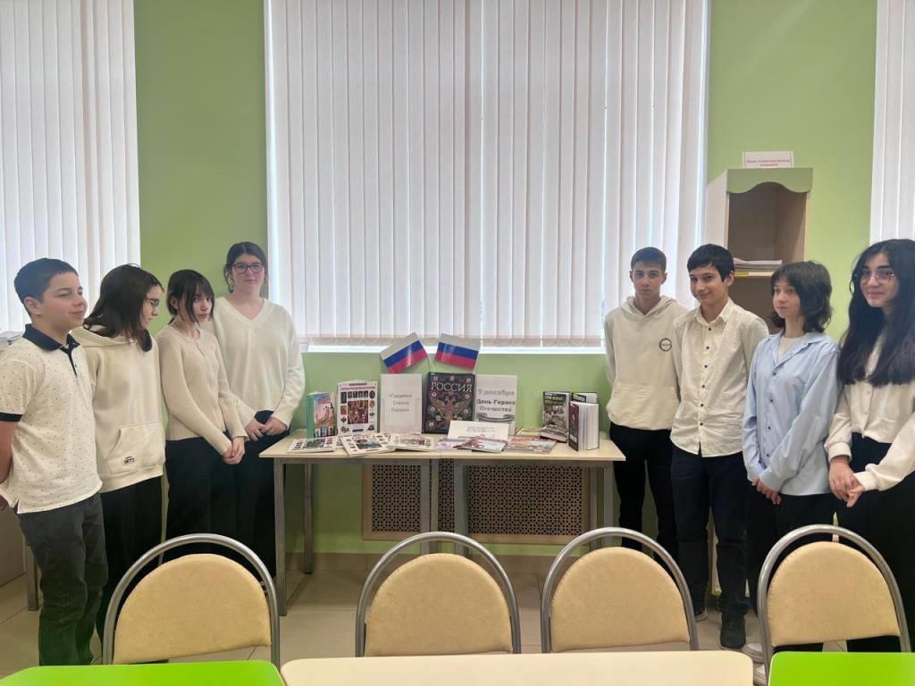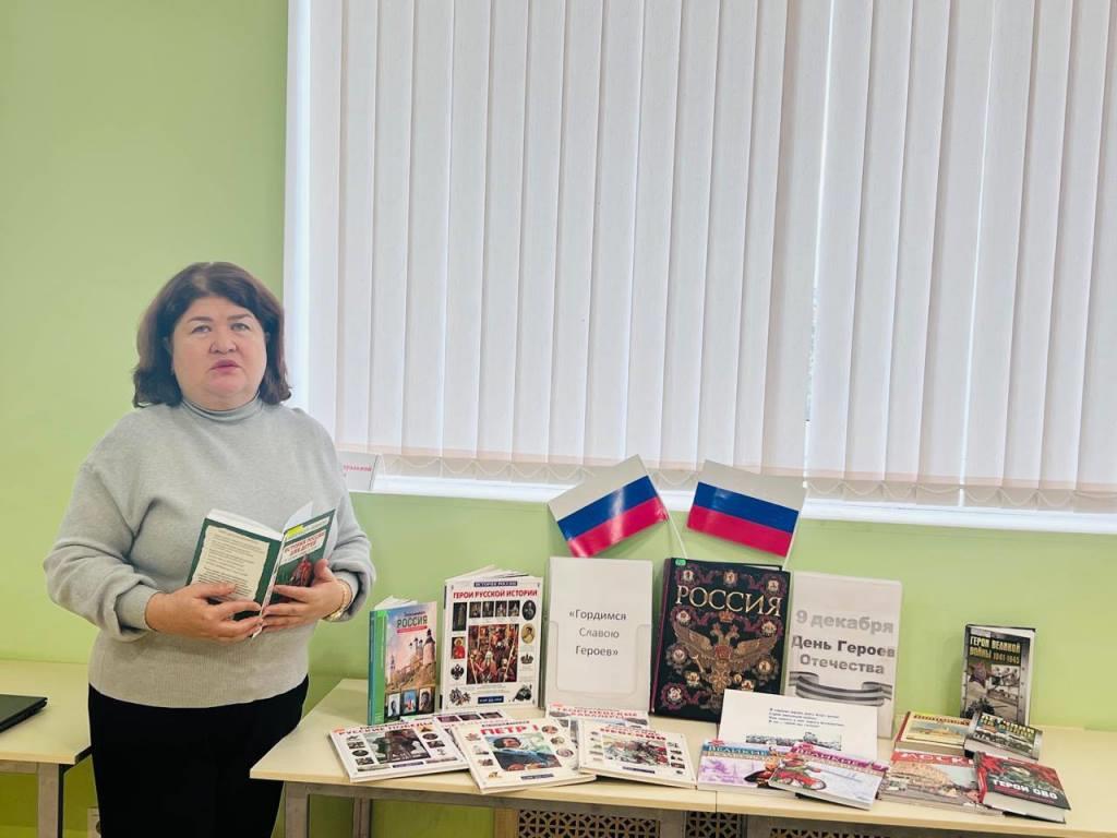 Мероприятие сопровождалось видеопрезентацией «Славные сыны Отечества». Затем состоялся обзор книжной выставки «Гордимся славою героев», где была представлена литература о героях Отечества разных эпох.