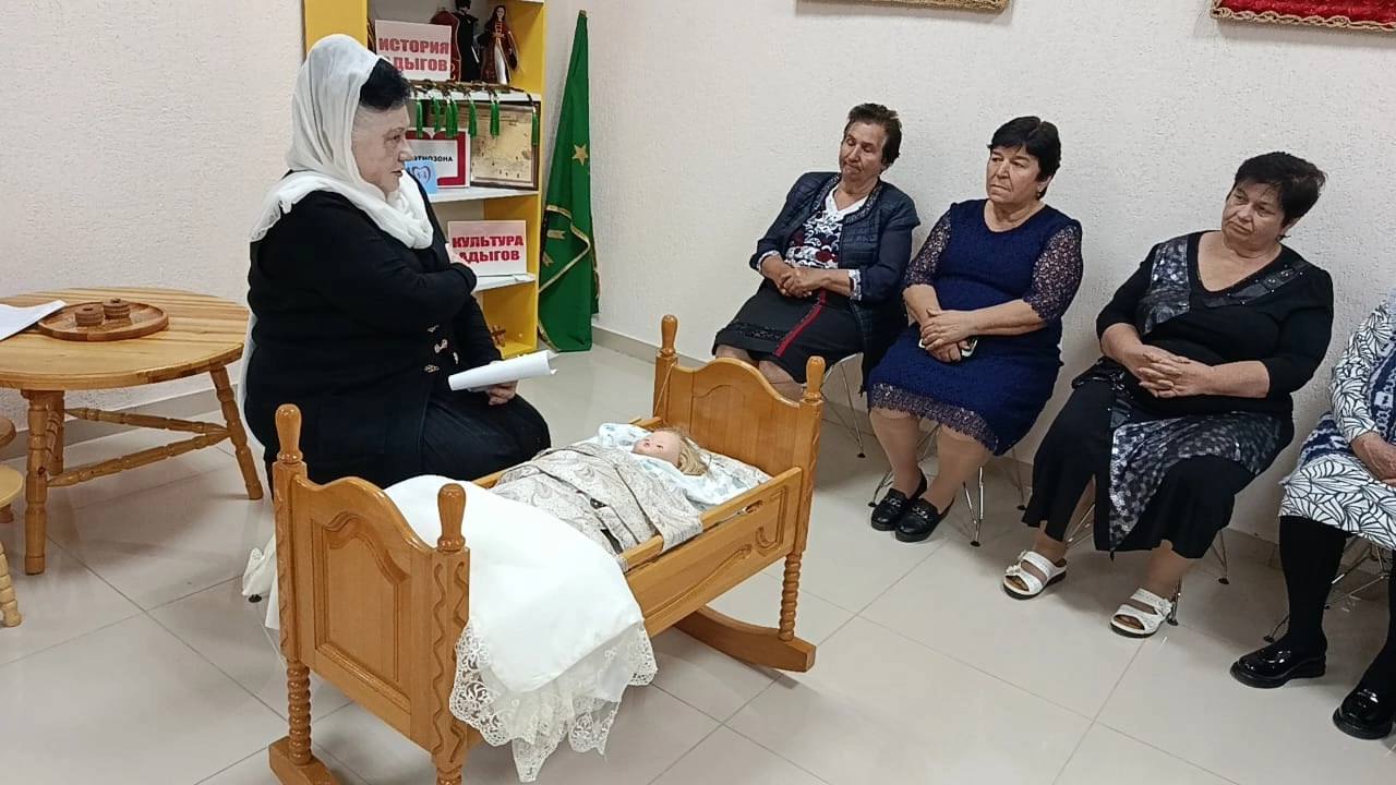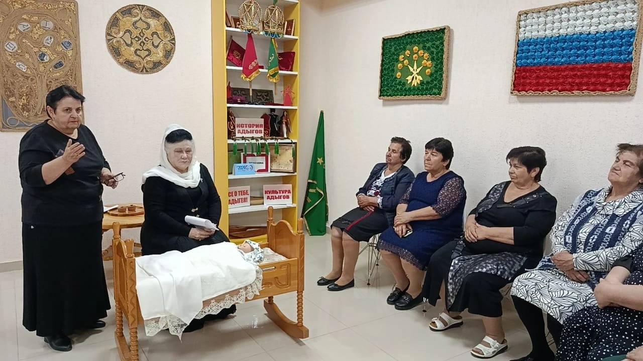 «Кушъэхапхэ» - общепринятое торжество с пожеланиями и поздравлениями. Работники Дома культуры спели «Кушъэ орэд» - адыгские народные колыбельные песни.