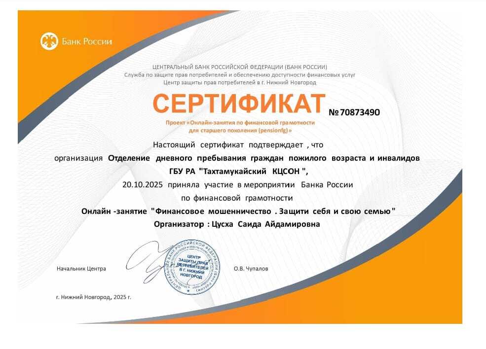 В отделении дневного пребывания граждан пожилого возраста и инвалидов Тахтамукайского района прошли онлайн-занятия по финансовой грамотности для старшего поколения: "Финансовое мошенничество. Защити себя и свою семью".