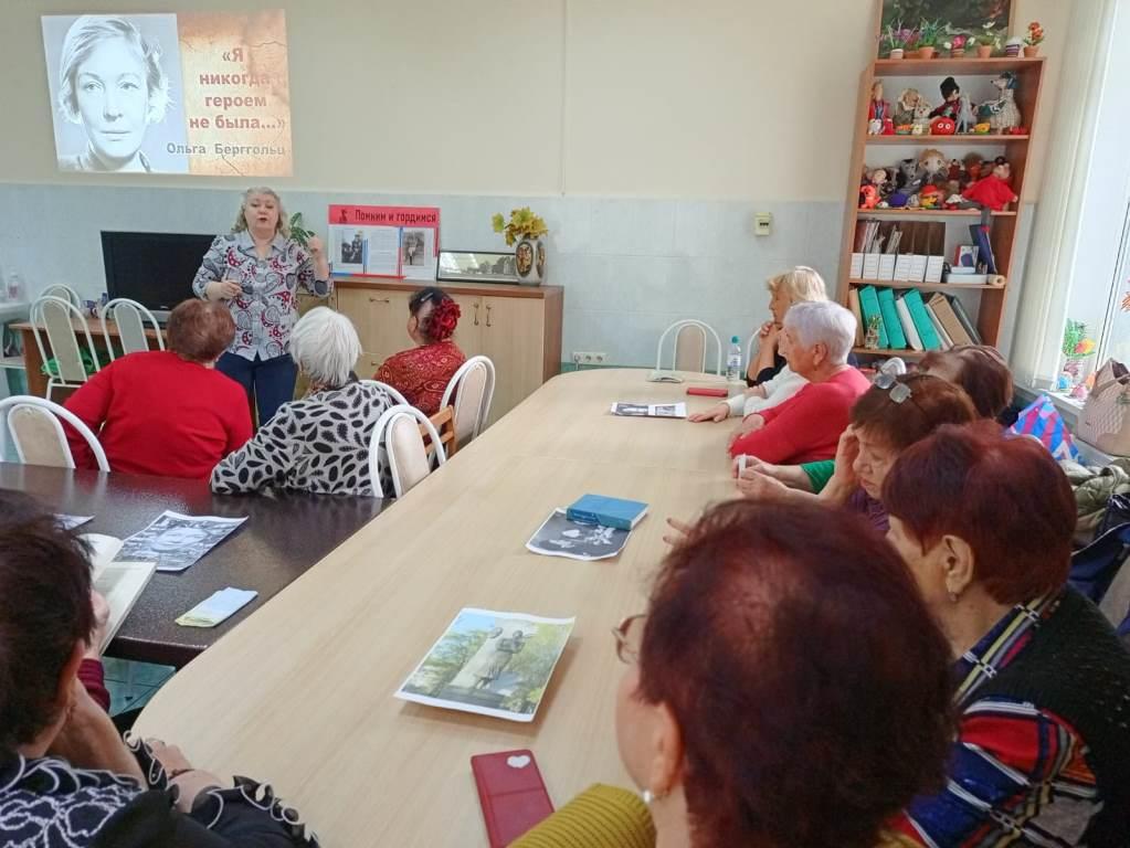 В завершение встречи был проведён обзор книжной выставки «Судьба и поэзия Ольги Берггольц», на которой были представлены материалы биографического характера, стихотворения, поэмы, рассказы, повести.