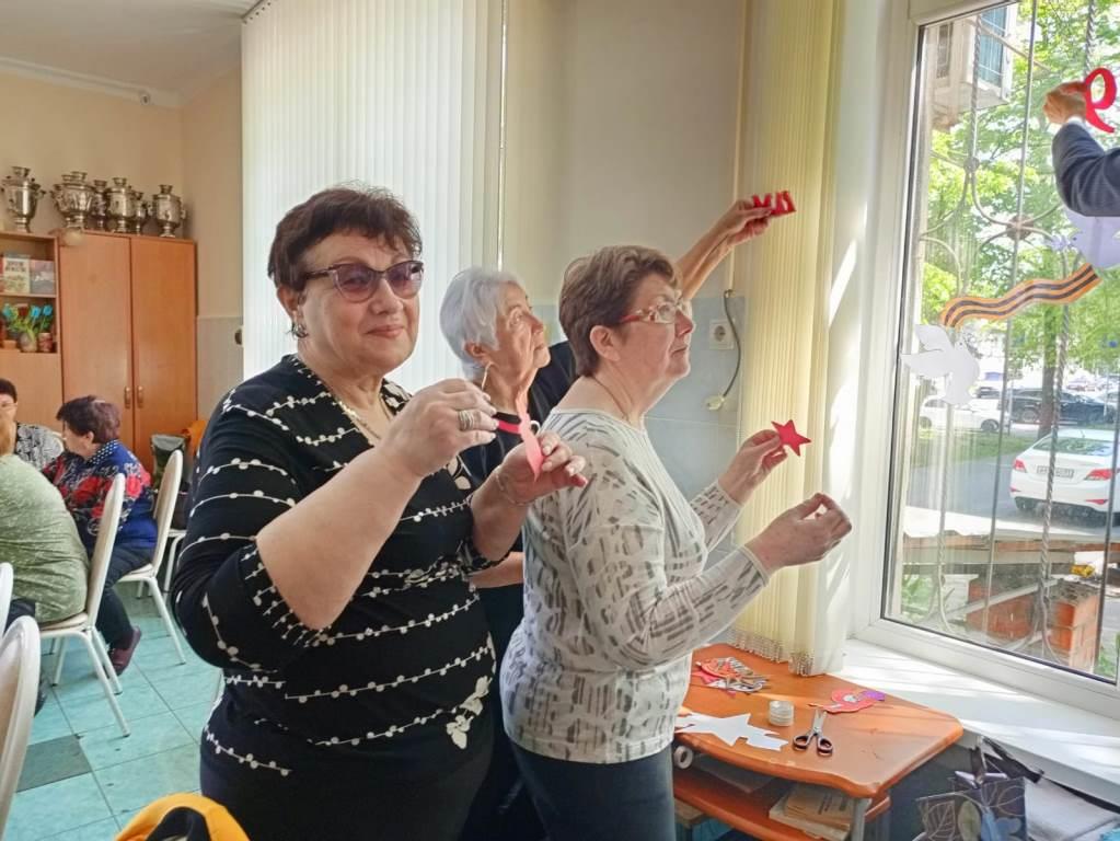 Также пожилые люди узнали, что символизируют журавли — это души погибших воинов и святую память о них, а голуби – символ мира и свободы. Участники мероприятий выбрали нужные трафареты, вырезали картинки и украсили окна учреждения. Благодаря участию в акции была создана атмосфера одного из самых важных праздников в России - Дня Победы.